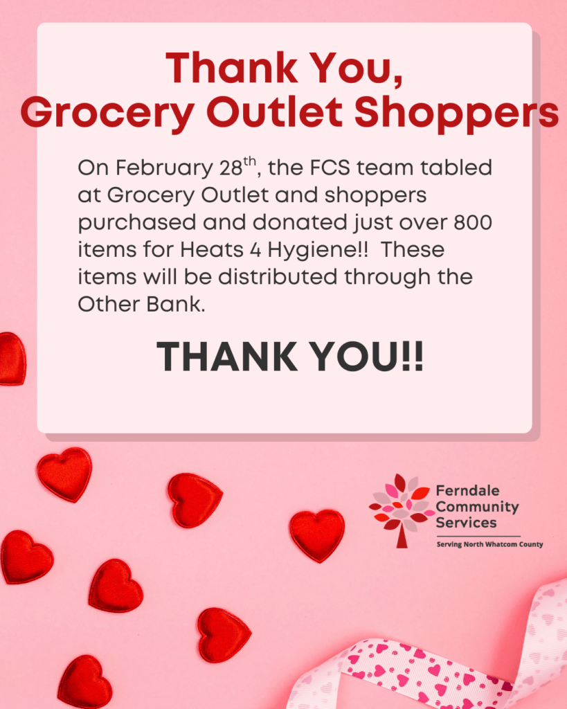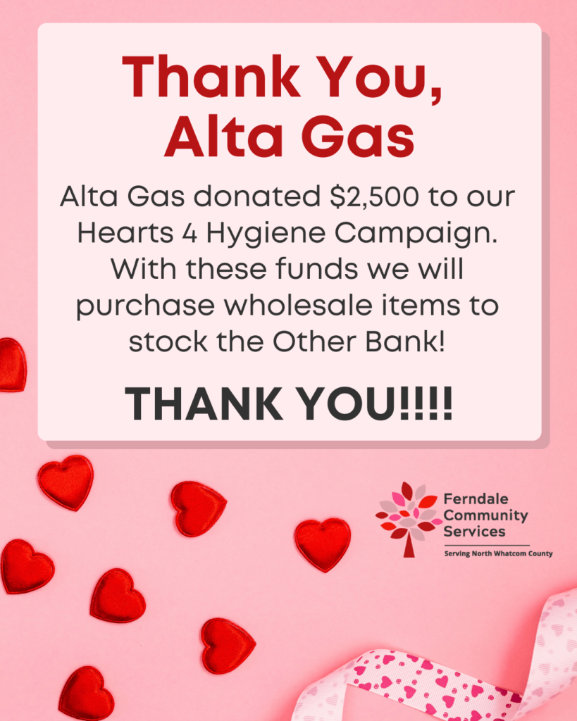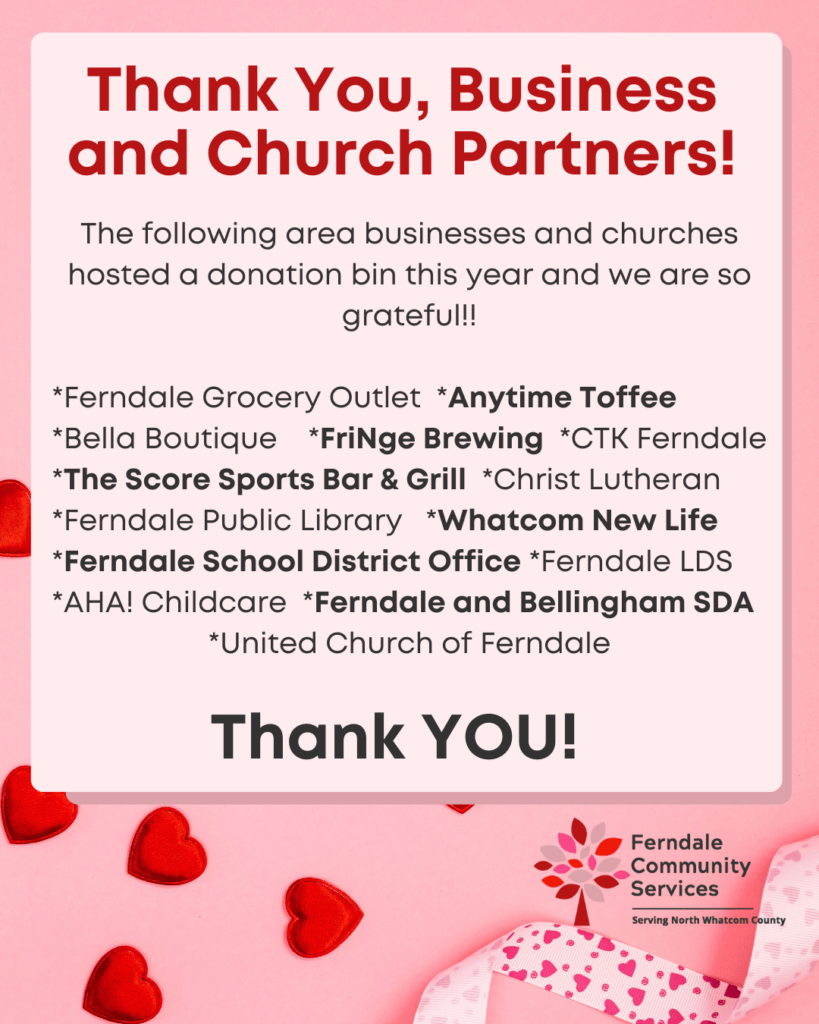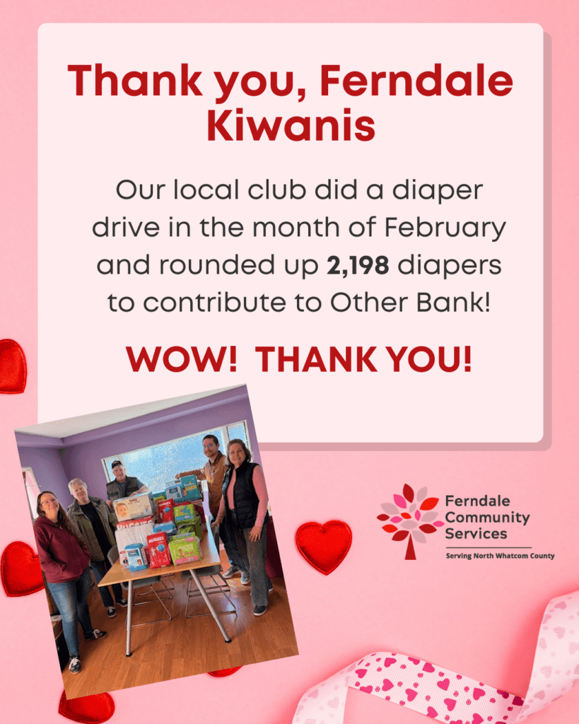 Welcome to Ferndale Community Services. Here you can learn about our programs and how we serve Ferndale and North Whatcom County, make a donation, or get in touch for services. We are glad you’re here!
